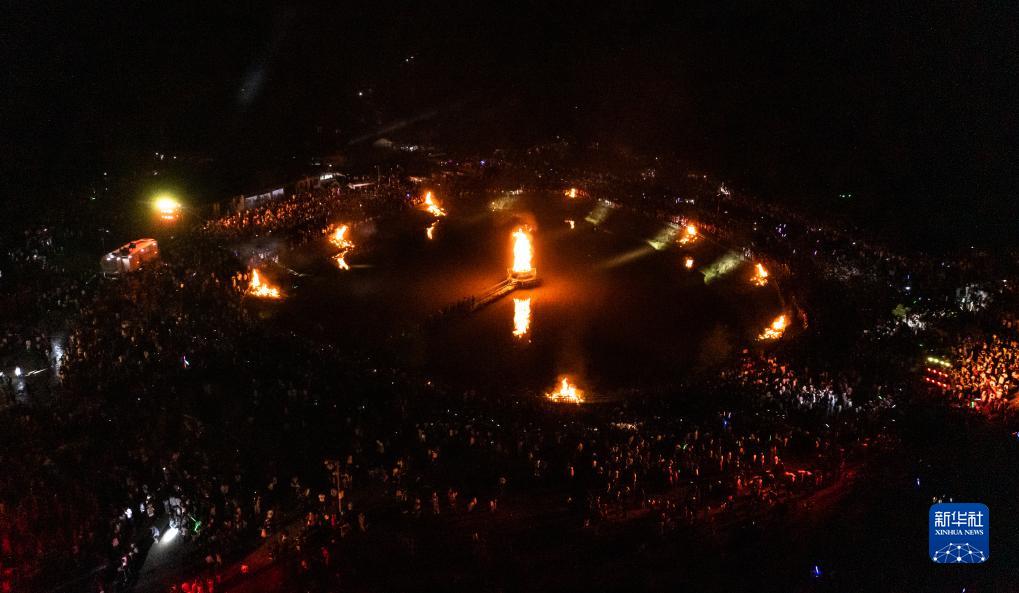 這是威寧彝族回族苗族自治縣板底鄉的篝火晚會(huì )現場(chǎng)(8月10日攝,無(wú)人機照片)。