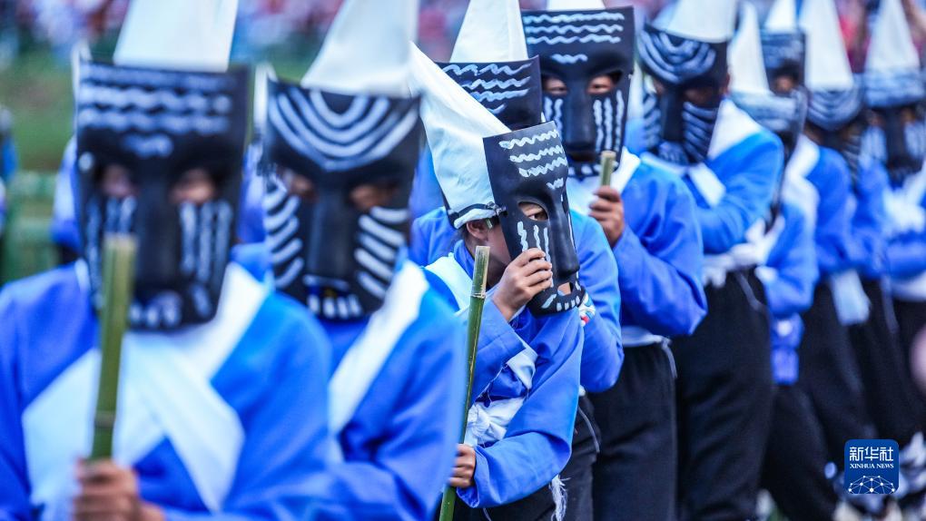 小朋友在火把節活動(dòng)上表演彝族傳統戲劇“撮泰吉”(8月10日攝)。