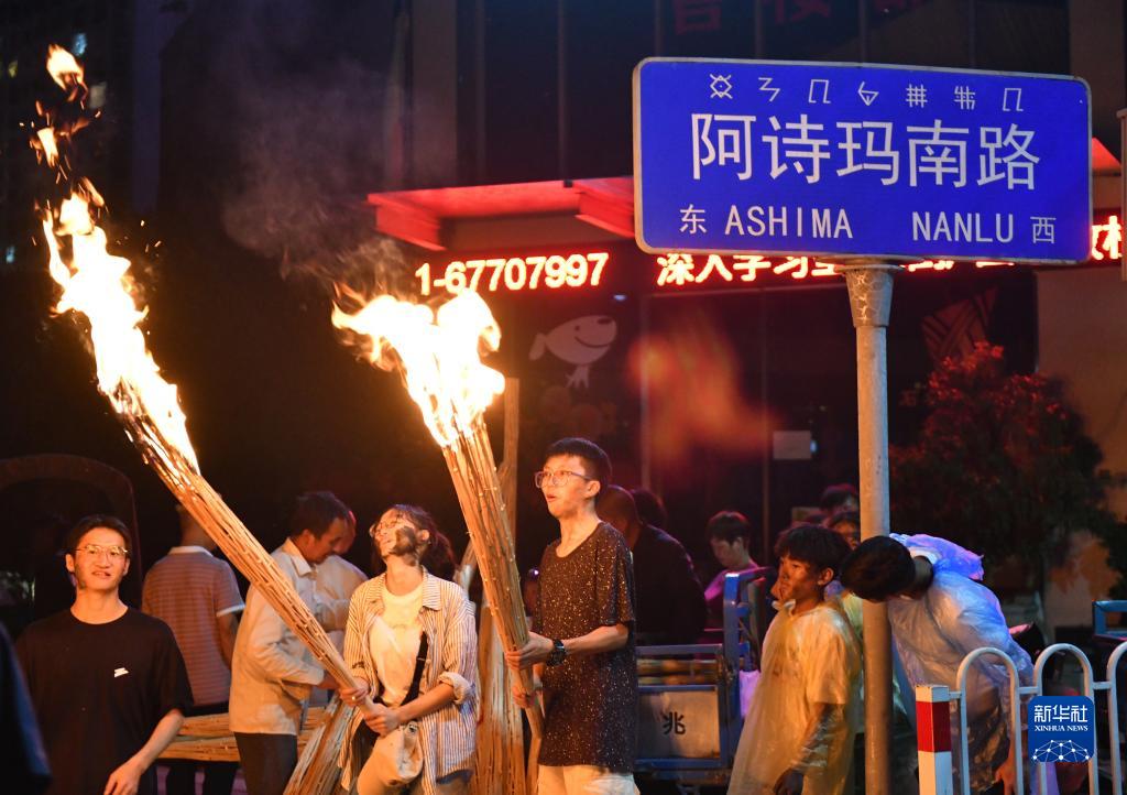 8月10日晚,兩名年輕人舉著(zhù)火把在歡慶火把節。