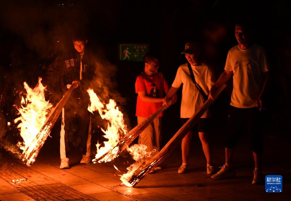 8月10日晚,幾名游客在火把節上點(diǎn)燃火把。