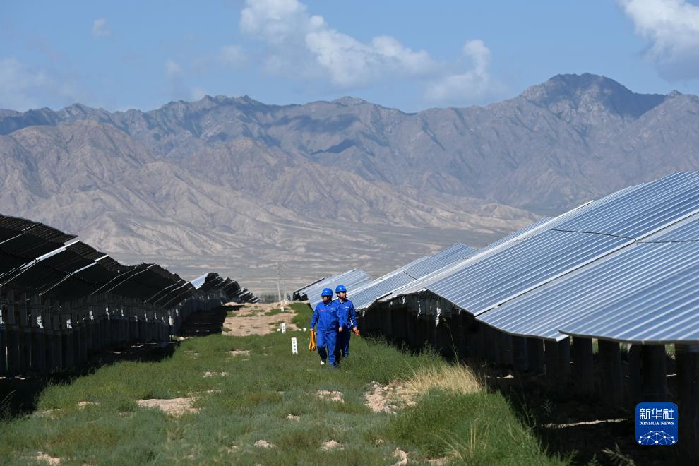 8月11日,工作人員在中國能建張掖甘州南灘30萬(wàn)千瓦光伏發(fā)電項目巡檢。