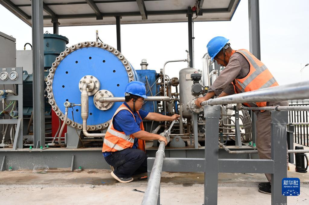 8月10日,工人在中國能建張掖氫能綜合應用示范項目調試氫氣加壓裝置。