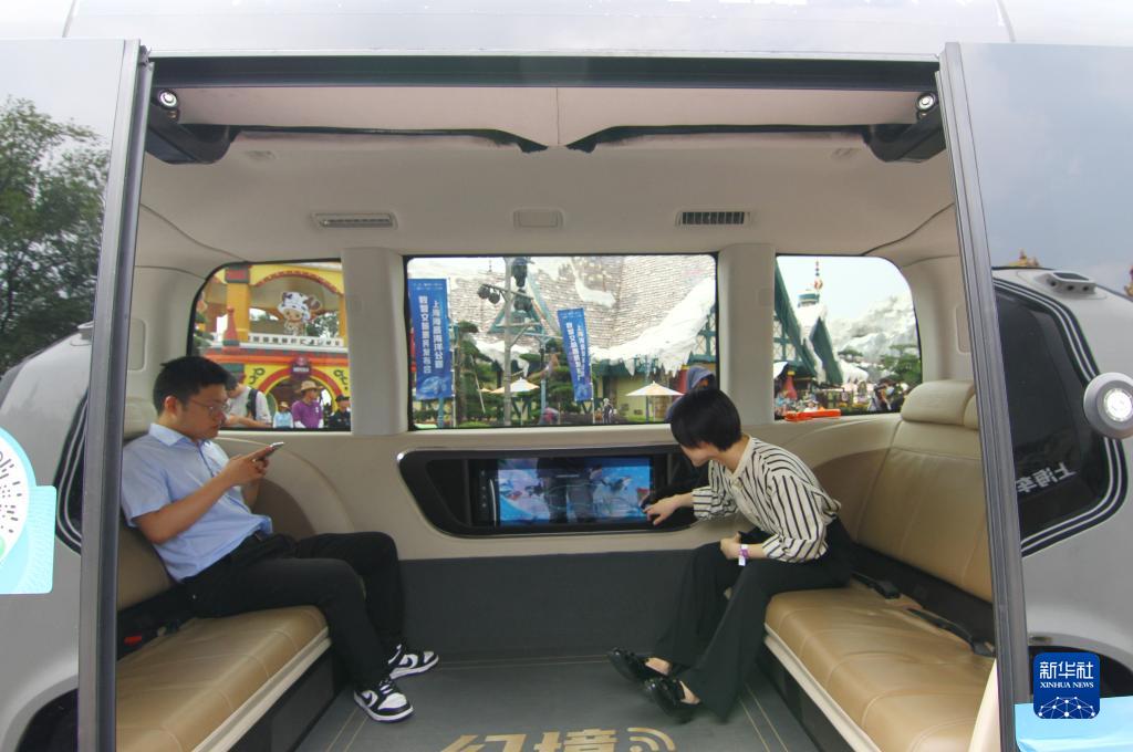 8月11日,受邀嘉賓在無(wú)人駕駛游覽車(chē)內體驗觸屏操作。