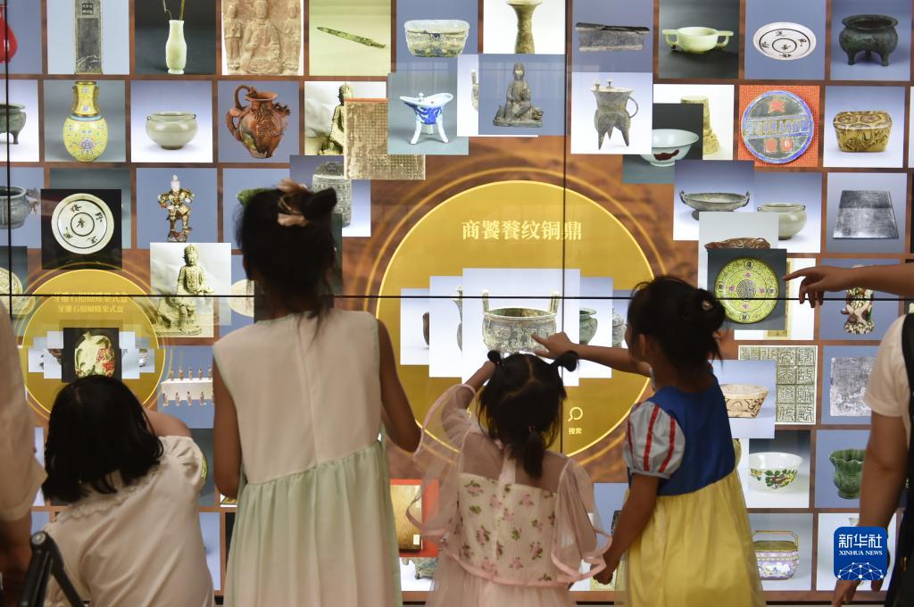 8月9日,小朋友在河南省開(kāi)封市博物館里體驗文物電子展示交互大屏。