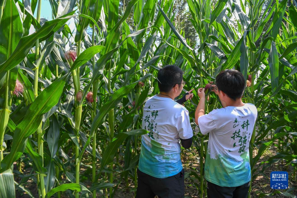 7月31日,在位于吉林省四平市梨樹(shù)縣的中國農業(yè)大學(xué)“科技小院”試驗田,在讀博士生沙野(右)和在讀碩士生蔣家偉查看作物生長(cháng)情況。