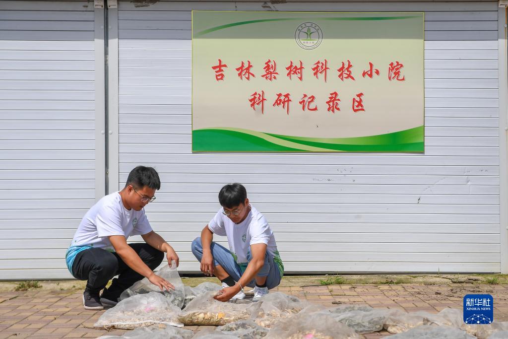 8月10日,在位于吉林省四平市梨樹(shù)縣的中國農業(yè)大學(xué)“科技小院”,在讀博士生沙野(左)和在讀碩士生高銘陽(yáng)查看作物樣本。