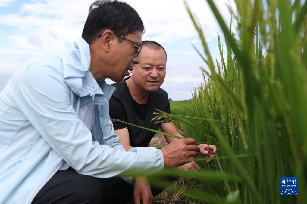 8月11日,黑龍江省尚志市農業(yè)技術(shù)推廣中心的工作人員在當地一處被洪水浸泡過(guò)的水稻田里查看水稻情況。