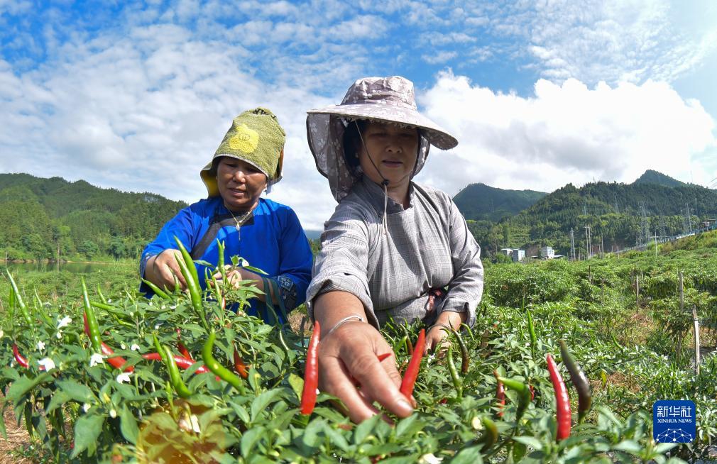 8月11日,在貴州省黔東南苗族侗族自治州從江縣下江鎮平江村辣椒種植基地,村民在采摘辣椒。