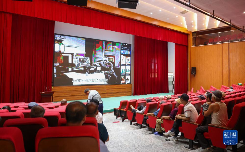 8月11日,居民在吉林省舒蘭市舒蘭三中居民安置點(diǎn)看電影。