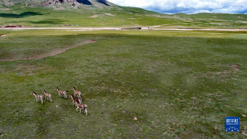 通天河支流辮狀河道旁的藏野驢(7月26日攝,無(wú)人機照片)。
