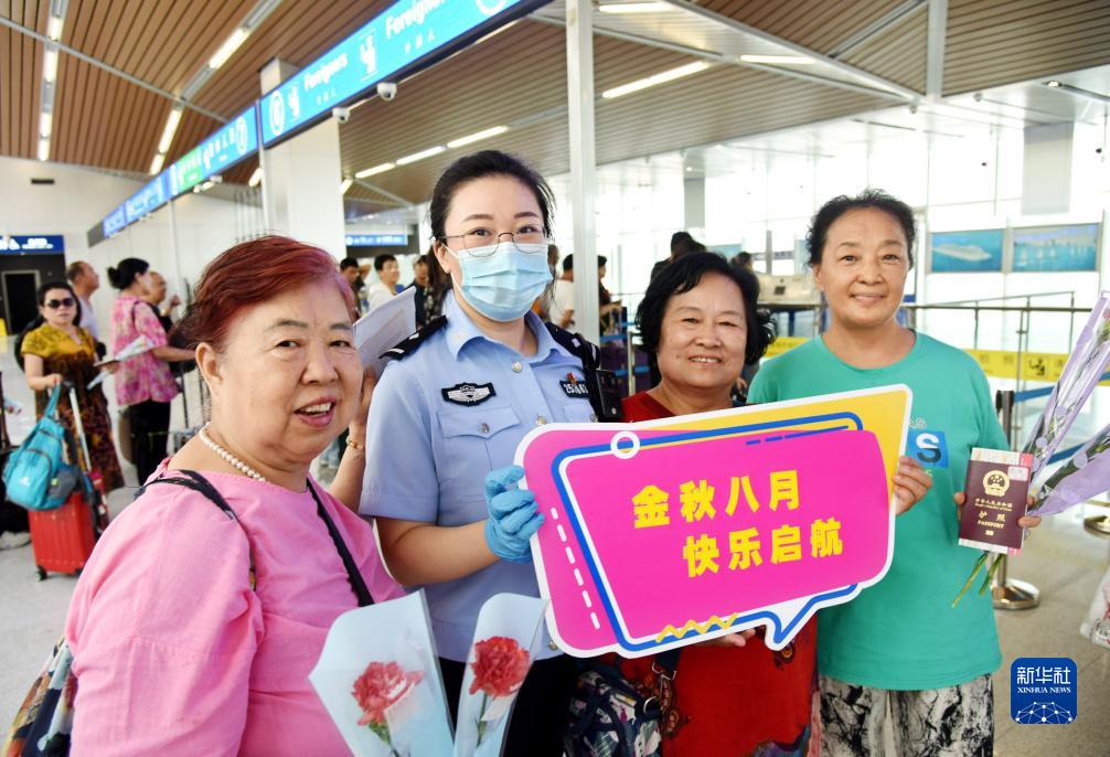 8月11日,旅客在青島郵輪母港復航儀式上合影。