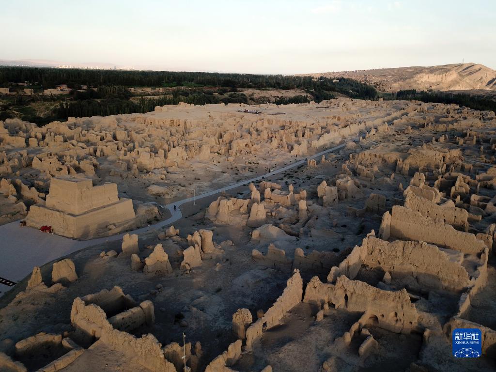 8月11日拍攝的夕陽(yáng)下的交河故城(無(wú)人機照片)。