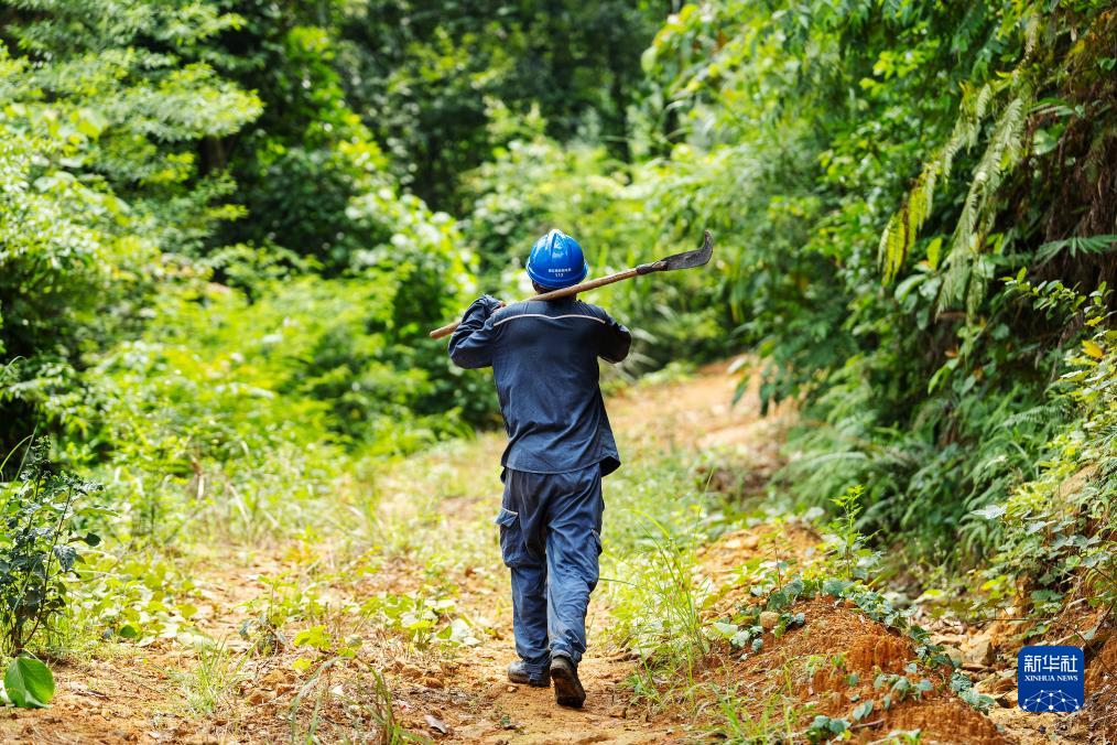 8月10日,對10千伏浦寨Ⅱ線(xiàn)19號塔的巡視結束后,渾身濕透的溫賢文扛著(zhù)大砍刀走在山路上。新華社記者 費茂華 攝
