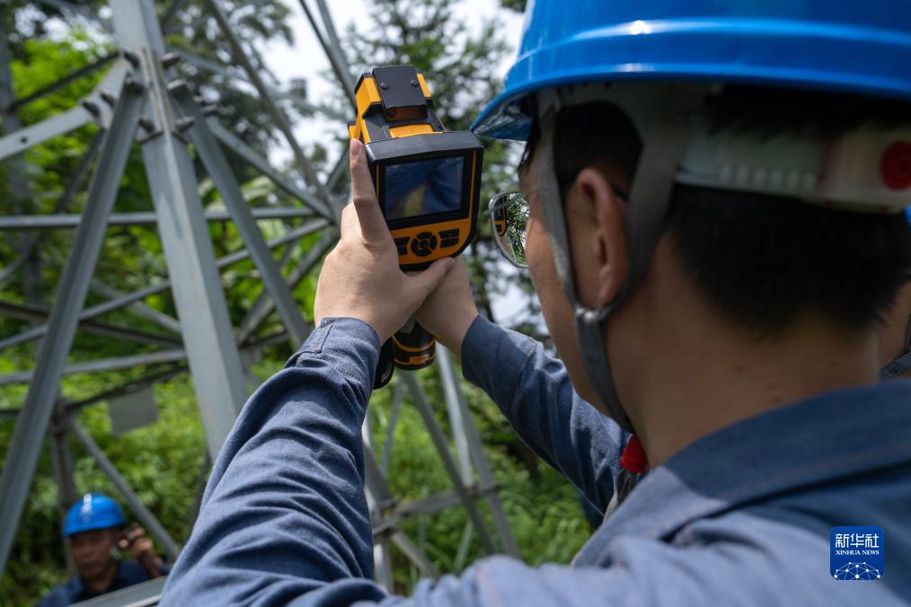 8月10日,李英興用紅外成像測溫儀對桿塔進(jìn)行測溫。新華社記者 費茂華 攝
