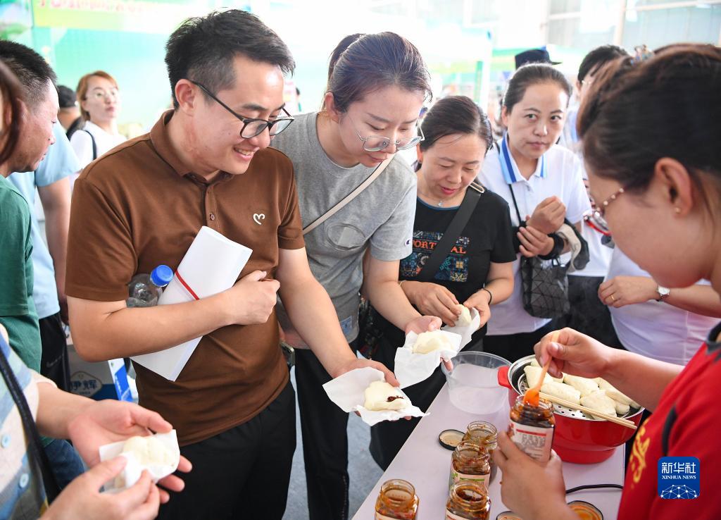 8月12日,參觀(guān)者在展銷(xiāo)會(huì )上品嘗特色食品。