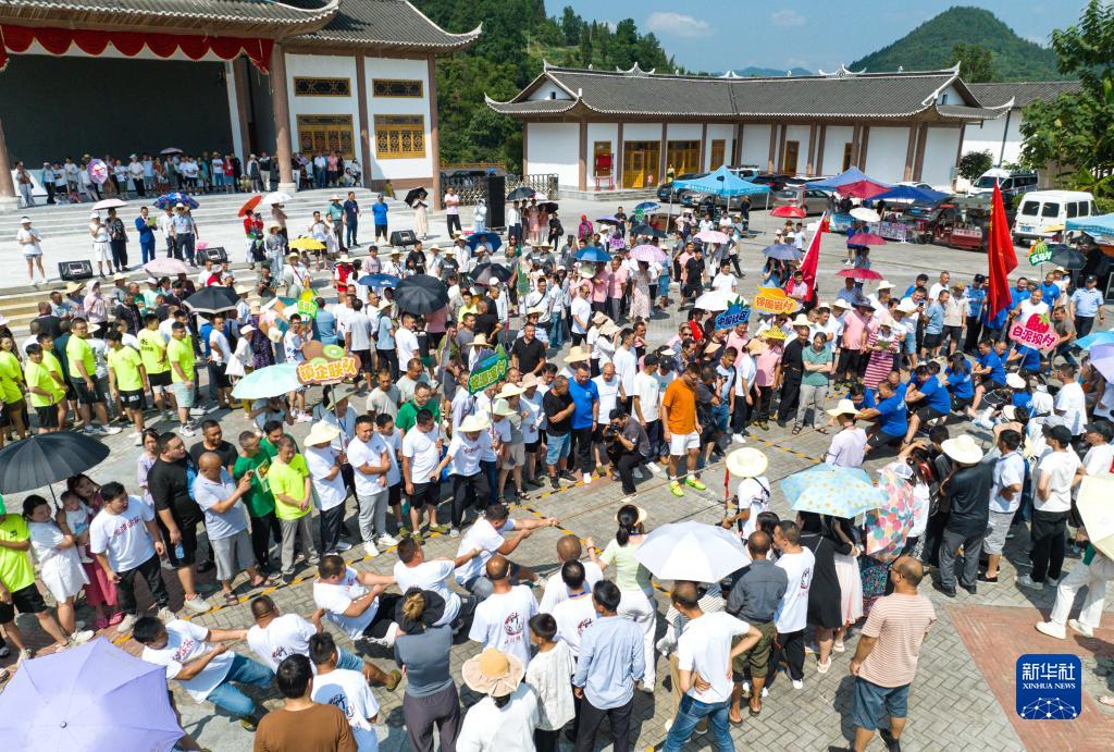 8月12日,人們在宣恩縣椒園鎮黃坪村的景區趣味運動(dòng)會(huì )上參加拔河比賽(無(wú)人機照片)。