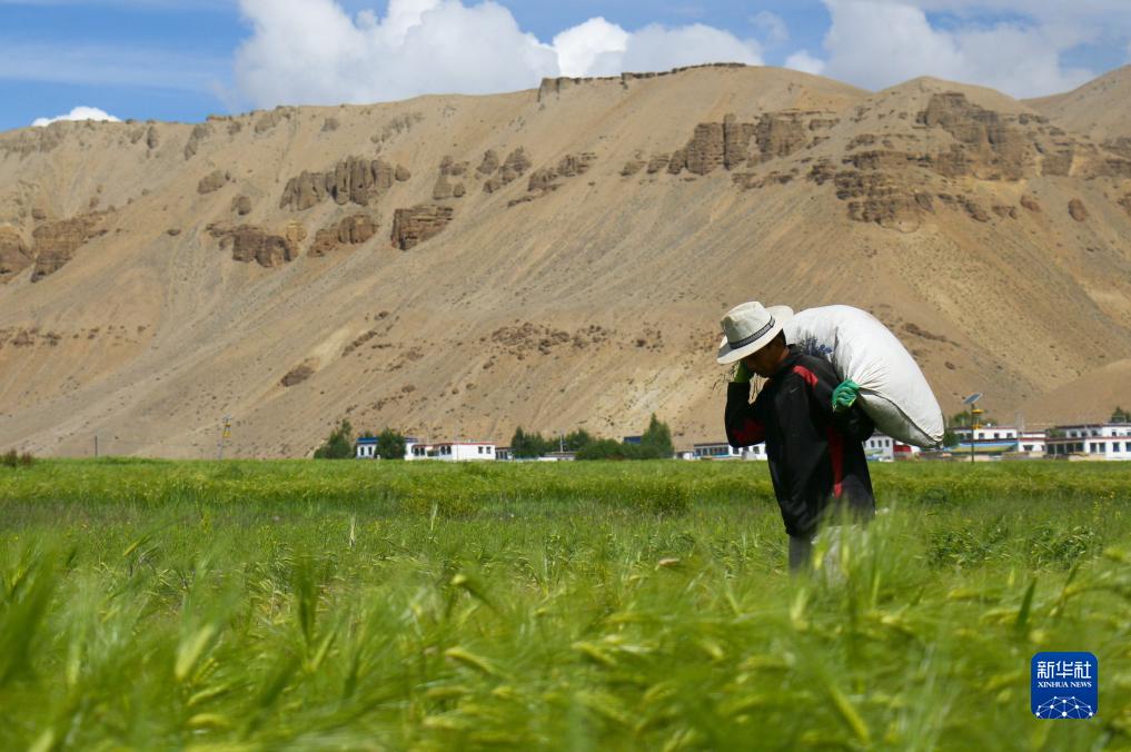8月12日,西藏阿里地區普蘭縣赤德村村民在青稞田里勞作。