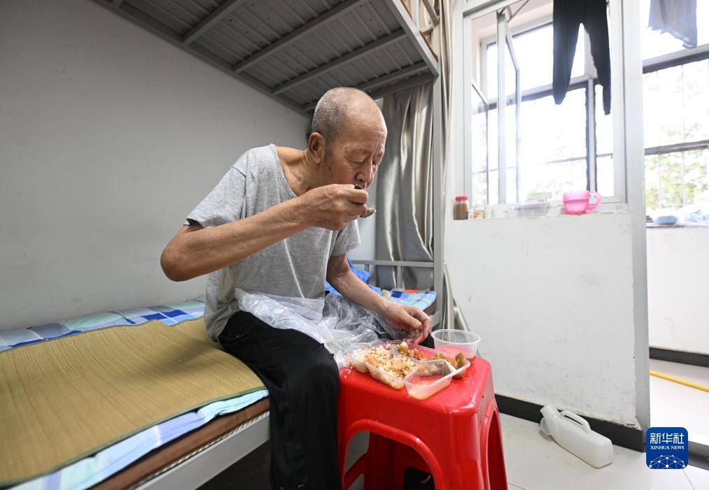 8月12日,在天津市靜海區大邱莊中學(xué)集中安置點(diǎn),老人在宿舍內就餐。