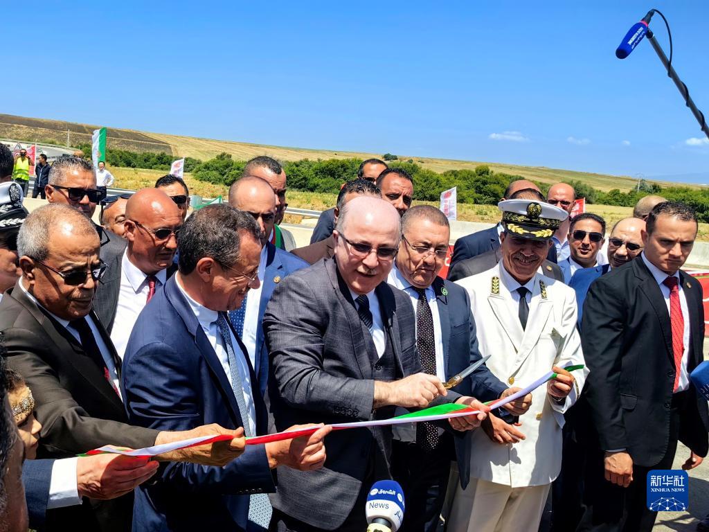 8月12日,在阿爾及利亞塔夫省,阿爾及利亞總理阿卜杜拉赫曼(前左三)出席阿爾及利亞?wèn)|西高速公路東標段84公里項目通車(chē)儀式并剪彩。