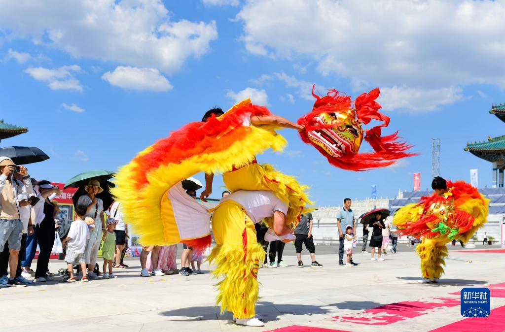 8月13日,在鄂爾多斯文化產(chǎn)業(yè)園景區,民間藝人表演舞獅。