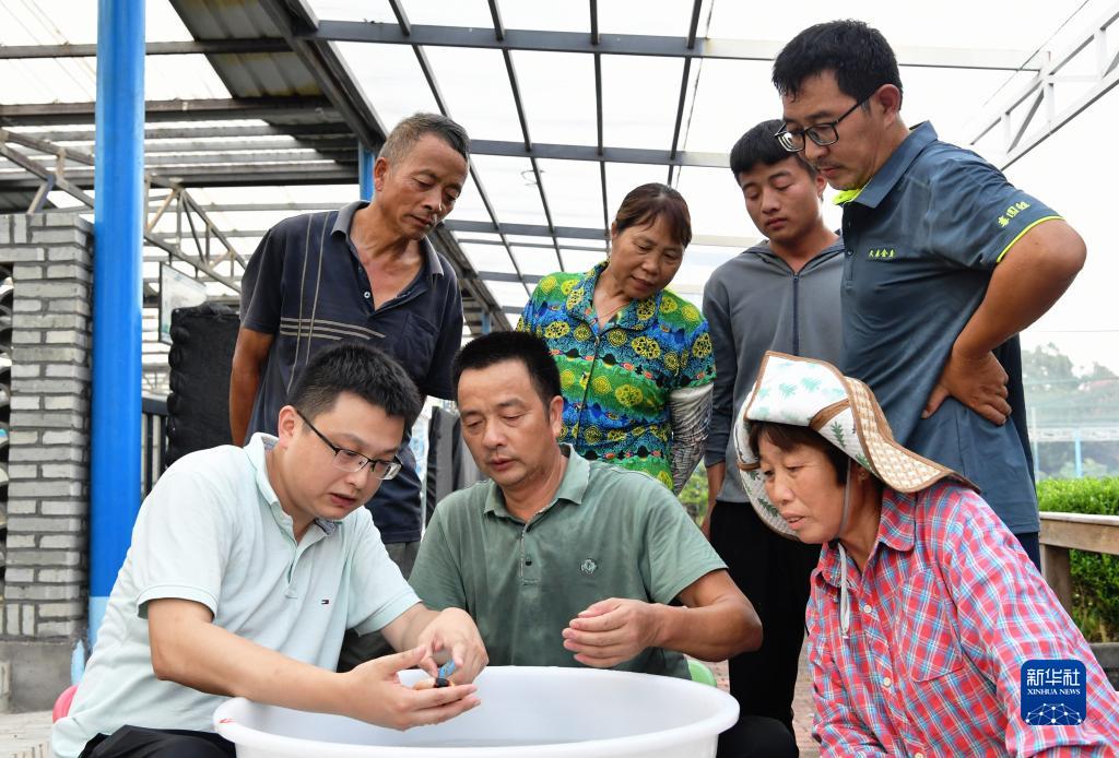 在福州市閩侯縣南通鎮古城村春園鯉生態(tài)養殖場(chǎng),科技特派員、福建師范大學(xué)生命科學(xué)學(xué)院博士黃鎮(左一)在給古城村養殖戶(hù)們傳授金魚(yú)選種育種技術(shù)(8月9日攝)。