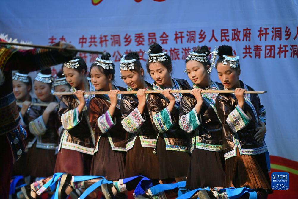 廣西融水苗族自治縣桿洞鄉堯告村的大學(xué)生們在參加鄉里的文藝演出(8月1日攝)。