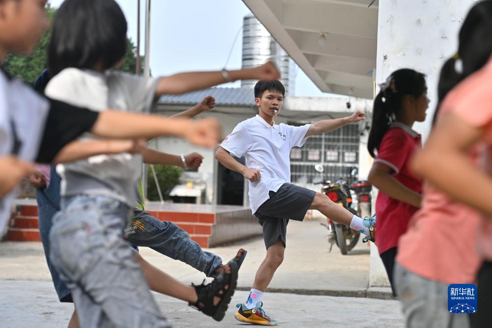 在廣西三江侗族自治縣獨峒鎮知了小學(xué),南通大學(xué)學(xué)生全少賢教孩子們學(xué)習武術(shù)(7月14日攝)。