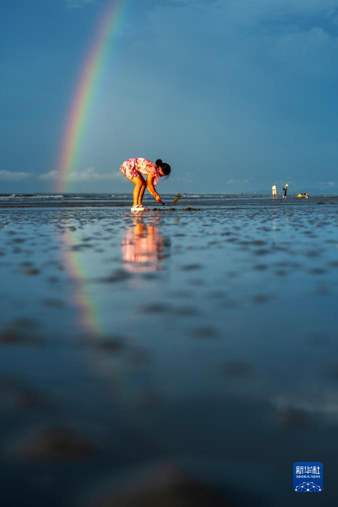 8月14日,小朋友在金灘出現的彩虹下玩耍。