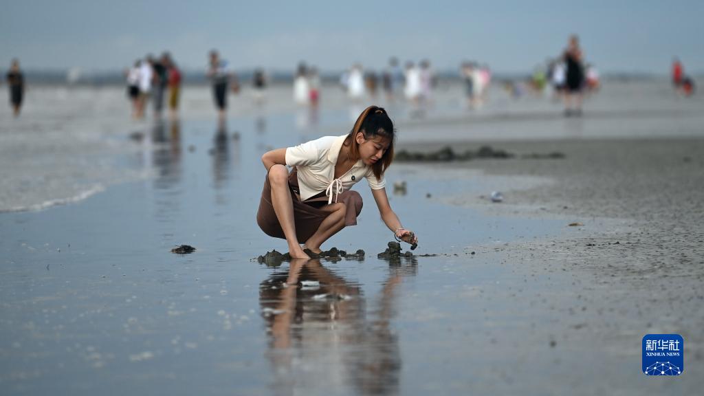 8月14日,日出時(shí)分,游客在金灘游玩。