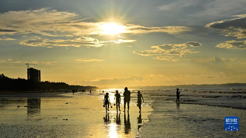 8月14日,游客在金灘上欣賞日出時(shí)的朝霞。