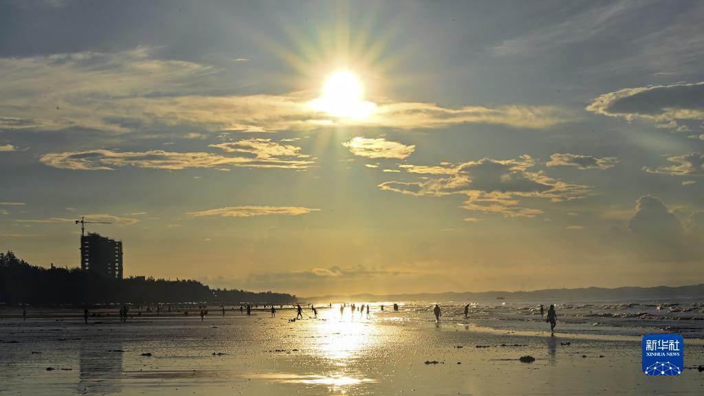 8月14日,日出時(shí)分,游客在金灘游玩。