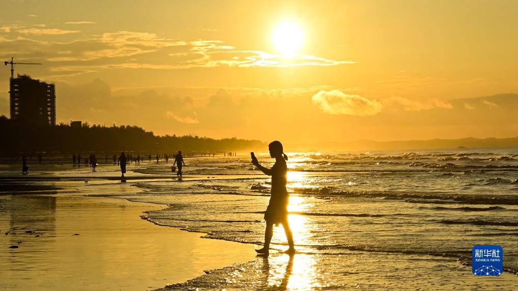 8月14日,游客在金灘上欣賞日出時(shí)的朝霞。