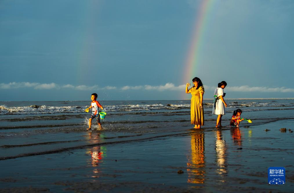 8月14日,游客在金灘出現的彩虹下游玩。