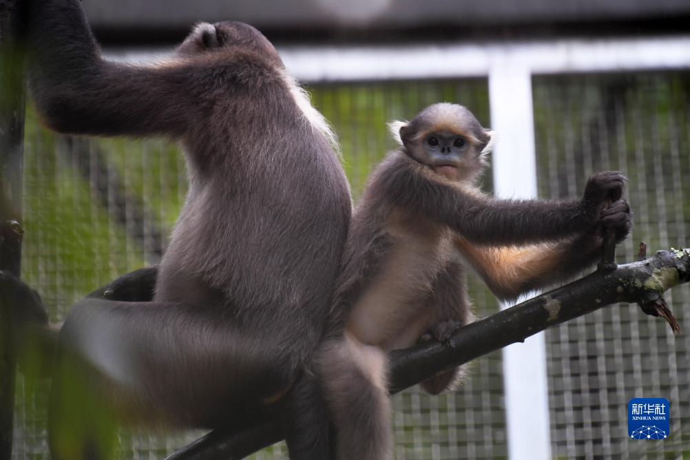 8月14日,兩只黔金絲猴在梵凈山野生動(dòng)物救護中心嬉戲。