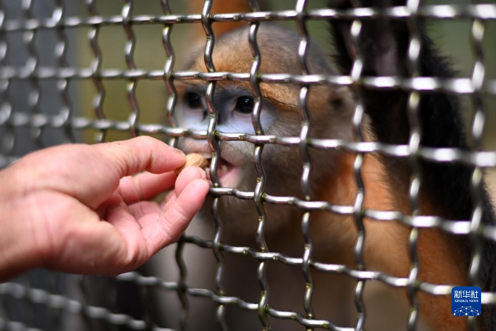 8月14日,在梵凈山野生動(dòng)物救護中心,工作人員給一只黔金絲猴喂食。