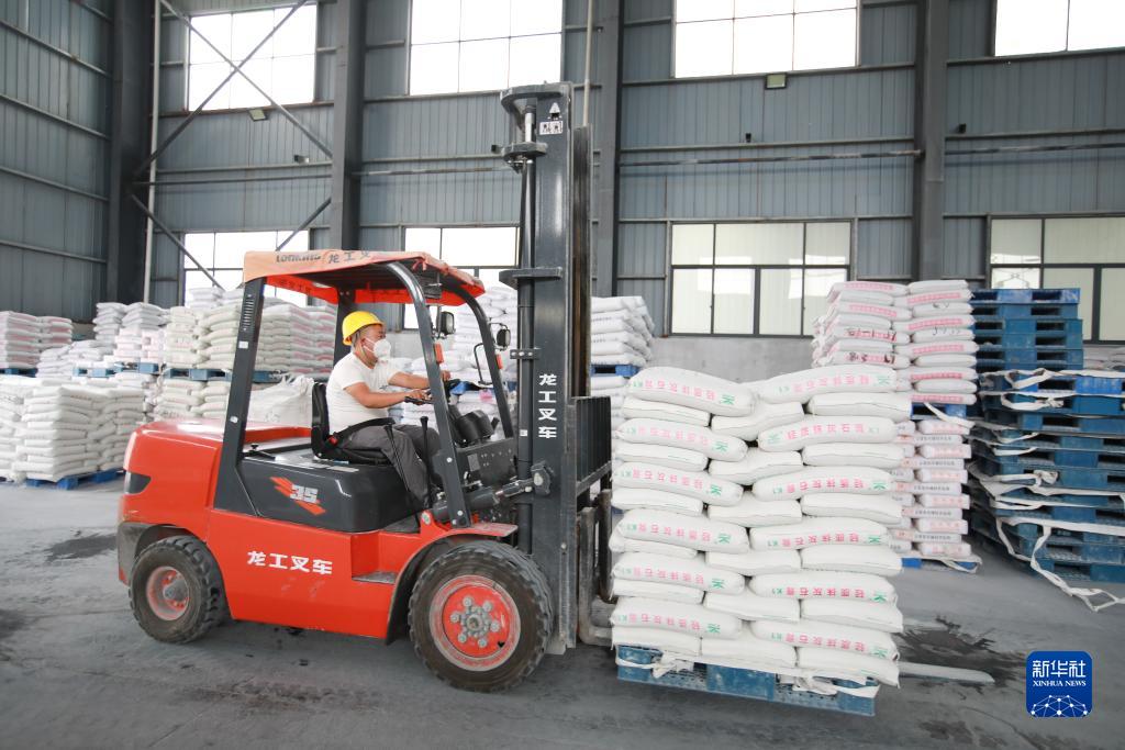 8月14日,工人在貴州磷化綠色環(huán)保產(chǎn)業(yè)有限公司石膏砂漿生產(chǎn)車(chē)間內運輸。