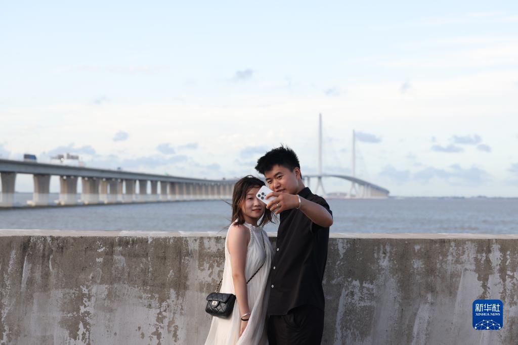 游客以上海長(cháng)江大橋為背景合影留念(2023年7月25日攝)。