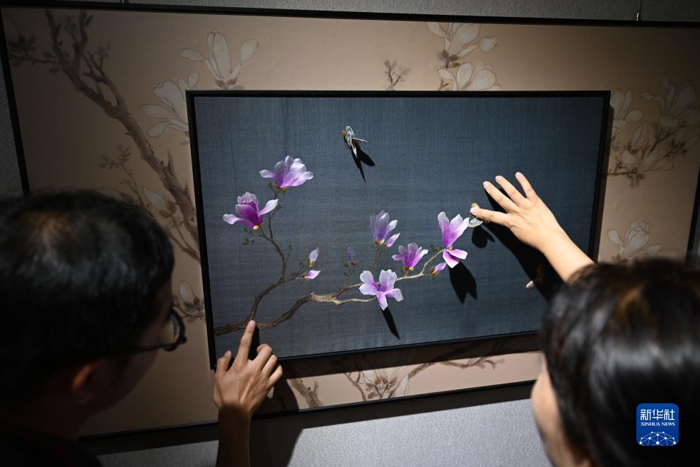 8月14日,觀(guān)眾與展出的蘇繡互動(dòng)。