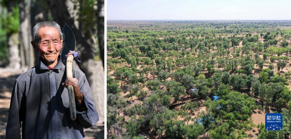 這是一張拼版照片。左圖為內蒙古鄂托克前旗呼和陶勒蓋嘎查的牧民曹扎娃出門(mén)勞作(6月14日攝);右圖為曹扎娃的承包地(6月14日攝,無(wú)人機照片)。20世紀80年代,在毛烏素沙地中,曹扎娃主動(dòng)承包了2300多畝沙地。這么多年來(lái),曹扎娃堅持種樹(shù)治沙,最終將沙地變成了林海。