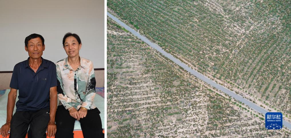 這是一張拼版照片。左圖為內蒙古達拉特旗官井村村民高二云和妻子的合影(8月11日攝);右圖為高二云夫妻在庫布其沙漠中種植的檸條(8月11日攝,無(wú)人機照片)。今年60歲的高二云從小便生活在庫布其沙漠中,20世紀80年代開(kāi)始和父輩們一起種樹(shù)治沙?,F在他與妻子在沙地里種植了5000多畝沙柳、檸條。