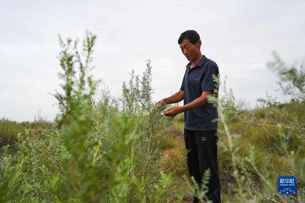 8月11日,內蒙古達拉特旗官井村村民高二云查看種植的檸條。