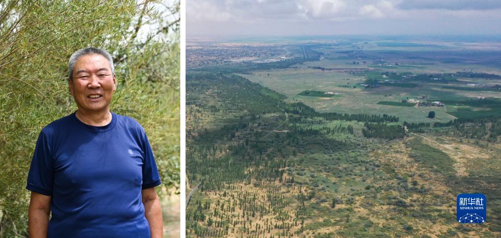 這是一張拼版照片。左圖為內蒙古杭錦旗道圖嘎查原支部書(shū)記陳寧布在自家草場(chǎng)留影(7月21日攝)。右圖為內蒙古杭錦旗道圖嘎查的植被(7月21日,無(wú)人機照片)。內蒙古杭錦旗道圖嘎查地處庫布其沙漠邊緣,過(guò)去生態(tài)環(huán)境惡劣。作為一名基層黨員,陳寧布不僅綠化了自家近千畝草場(chǎng),還帶動(dòng)農牧民一起綠化草場(chǎng)。