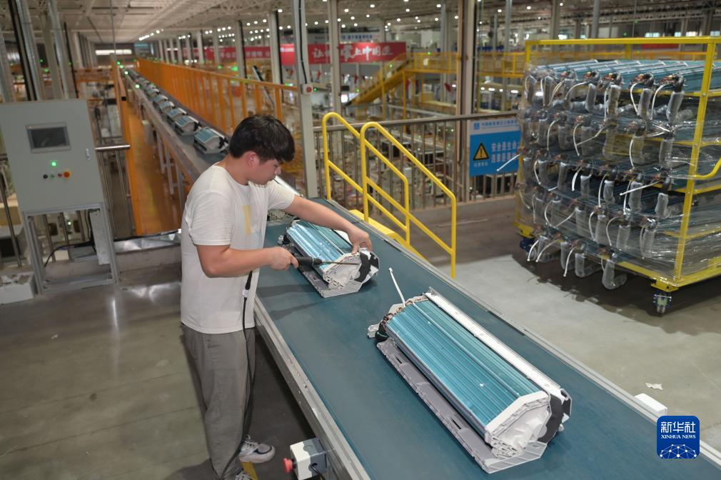 8月14日,在格力電器(贛州)有限公司,工人在空調生產(chǎn)線(xiàn)上工作。