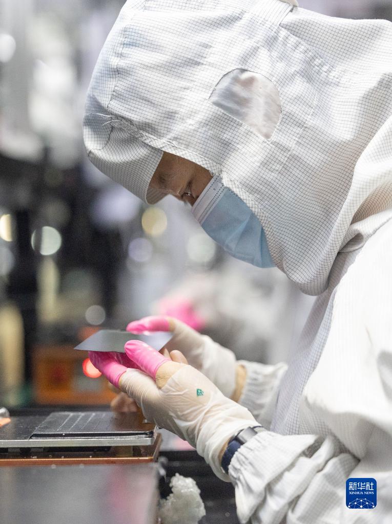 8月14日,在贛州市同興達科技有限公司(金鳳梅園廠(chǎng)區),工作人員觀(guān)察一款手機屏幕的蓋板玻璃。