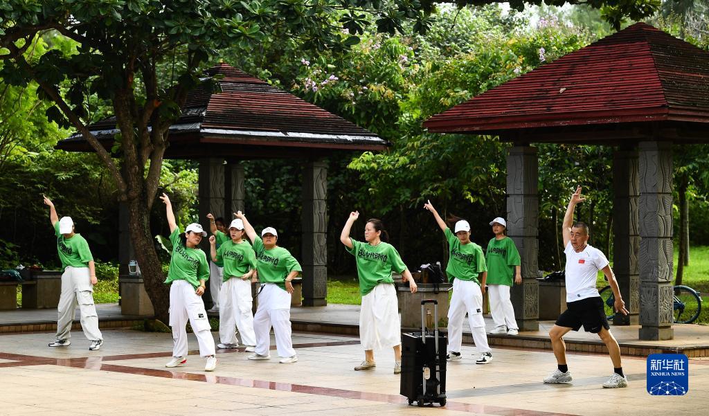 市民在??诎咨抽T(mén)公園內晨練(8月3日攝)。