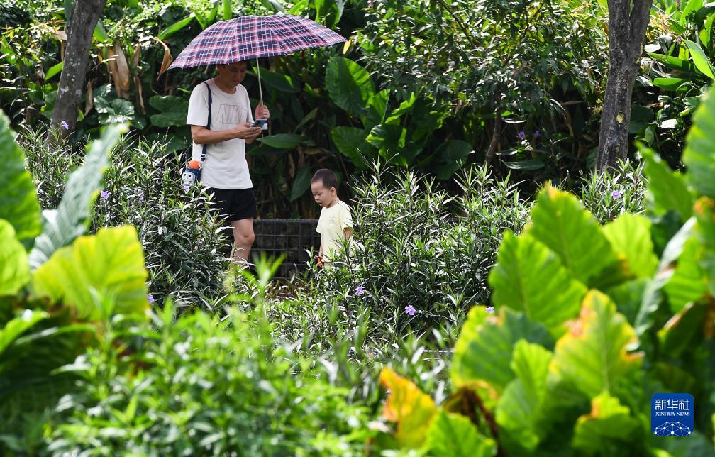 市民在??诿郎岷峪P翔濕地公園內游覽(8月2日攝)。