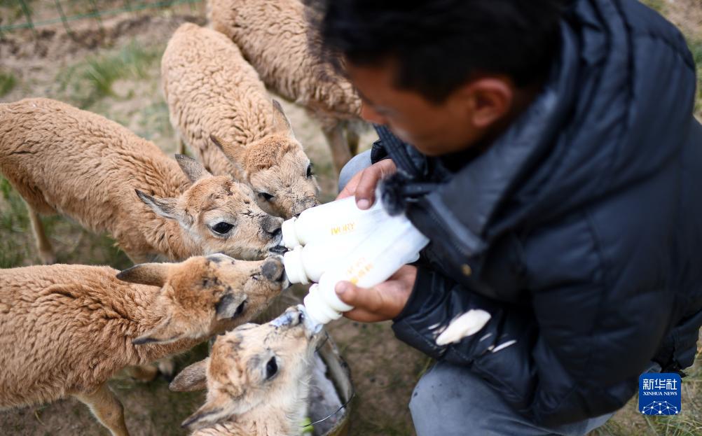 可可西里管理處索南達杰保護站隊員才仁多杰在給被救助的藏羚羊幼仔喂奶(7月28日攝)。