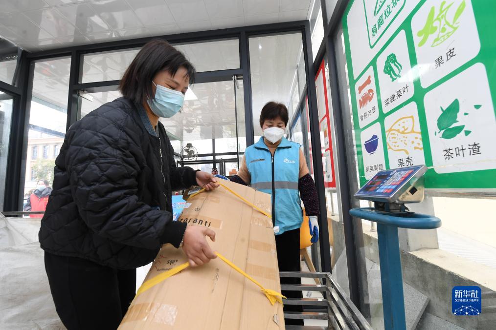 在湖州吳興區八里店鎮西湖漾社區再生資源回收站,居民將廢舊紙板帶來(lái)稱(chēng)重回收,現場(chǎng)結算現金(2023年2月22日攝)。
