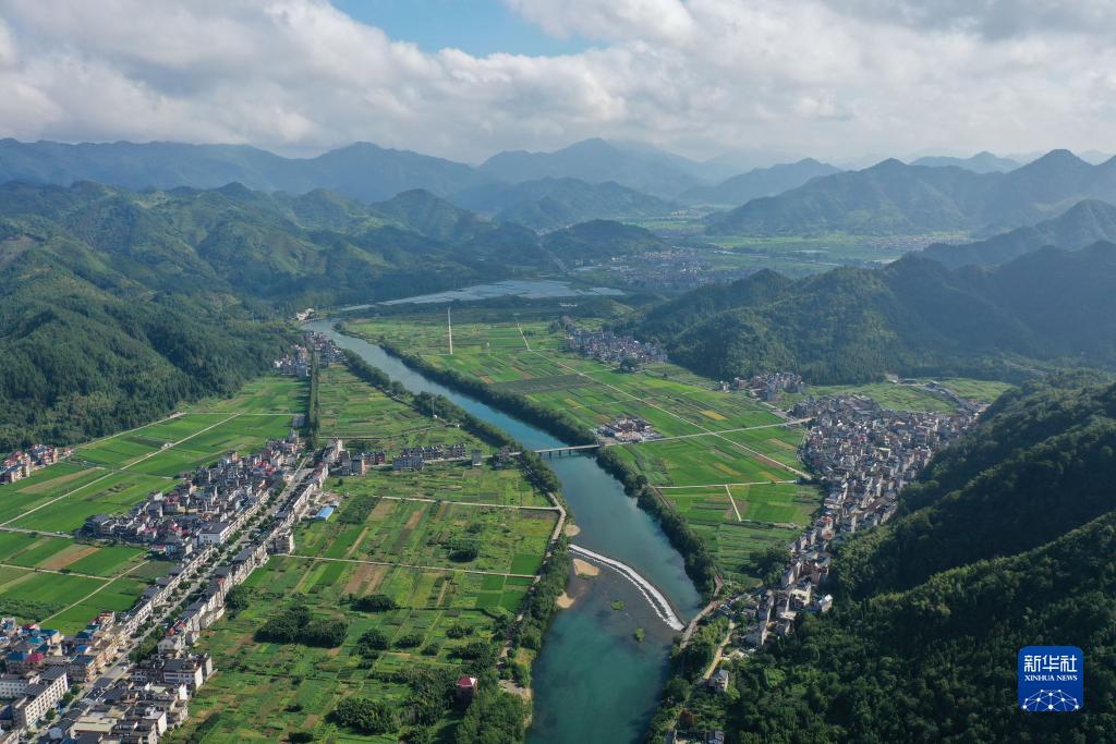 在浙江省衢州市開(kāi)化縣拍攝的錢(qián)塘江源頭河——馬金溪及沿岸村莊。當地最大限度地保留流域灘地灘林,將“固堤+綠岸+慢道”結合建設,帶動(dòng)鄉村旅游和民宿經(jīng)濟大力發(fā)展(8月2日攝,無(wú)人機照片)。