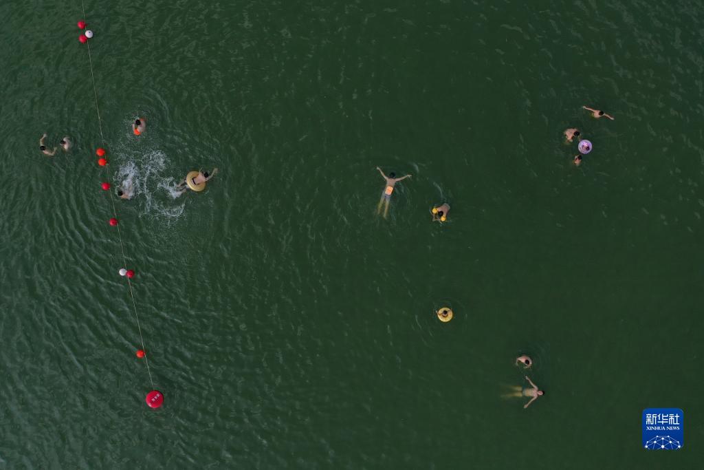 人們在流經(jīng)奉化區溪口鎮的剡江里游泳(8月11日攝,無(wú)人機照片)。